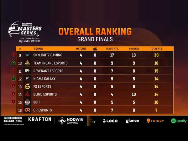 Enigma Gaming (18), Team GODL (15), and Team iNSANE Esports (13) finished on the top four positions.