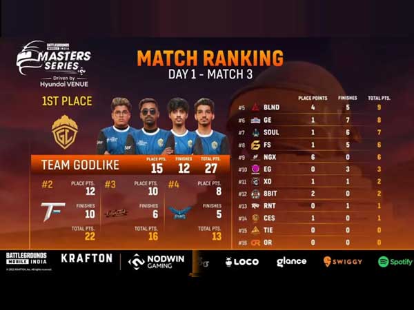 After the four matches on Day 1 of BGMS 2022 grand finals, Team GODLike emerged as the table toppers with 68 points. Global Esports also displayed a consistent performance throughout the Day 1 to claim the second spot in the overall rankings.