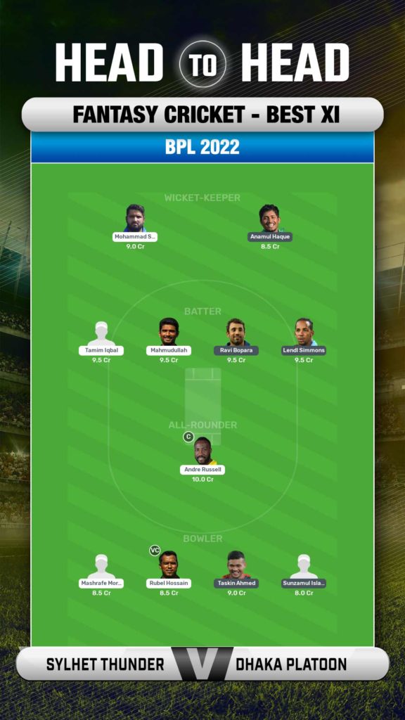 Nazmul Islam's 4-wicket haul and Taskin Ahmed's 3-wicket in 2.4 overs helped Thunder restrict Dhaka to 100 in their last face-off. Both the players are vital picks in the fantasy team as they will look to repeat their performance in the next performance. Anamul Haque (wk) played a good 45 run knock to ensure victory in a low-scoring match and must make the cut to the fantasy team.