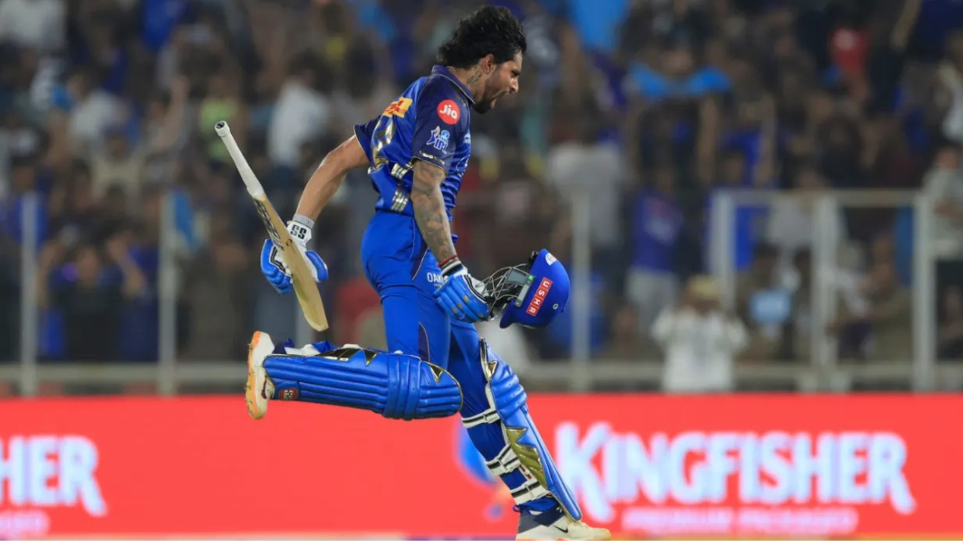 The Narendra Modi Stadium in Ahmedabad erupted as he hit a hat-trick of boundaries (6, 4, 6) in the final overs to storm into the triple digits. He reached the milestone on the very last ball of the innings with a boundary off Prasidh Krishna. After a slow start, he reached his fifty in 33 balls and then exploded, scoring his next 50 runs in just 12 balls.His innings rescued MI from a precarious 44/3 in the powerplay.