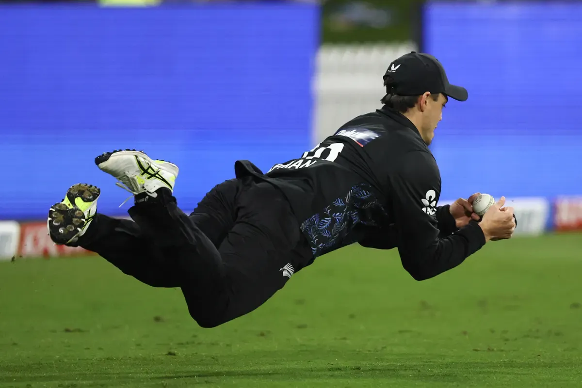 In the 14th over of the UAE innings, the batter, Alishan Sharafu, hits Santner’s bowl towards the deep midwicket fence, where Mark Chapman caught the ball near the boundary and smartly threw it back inside the rope just before stepping out, allowing Daryl Mitchell to complete the relay catch, making it one of the best catches of the tournament so far.