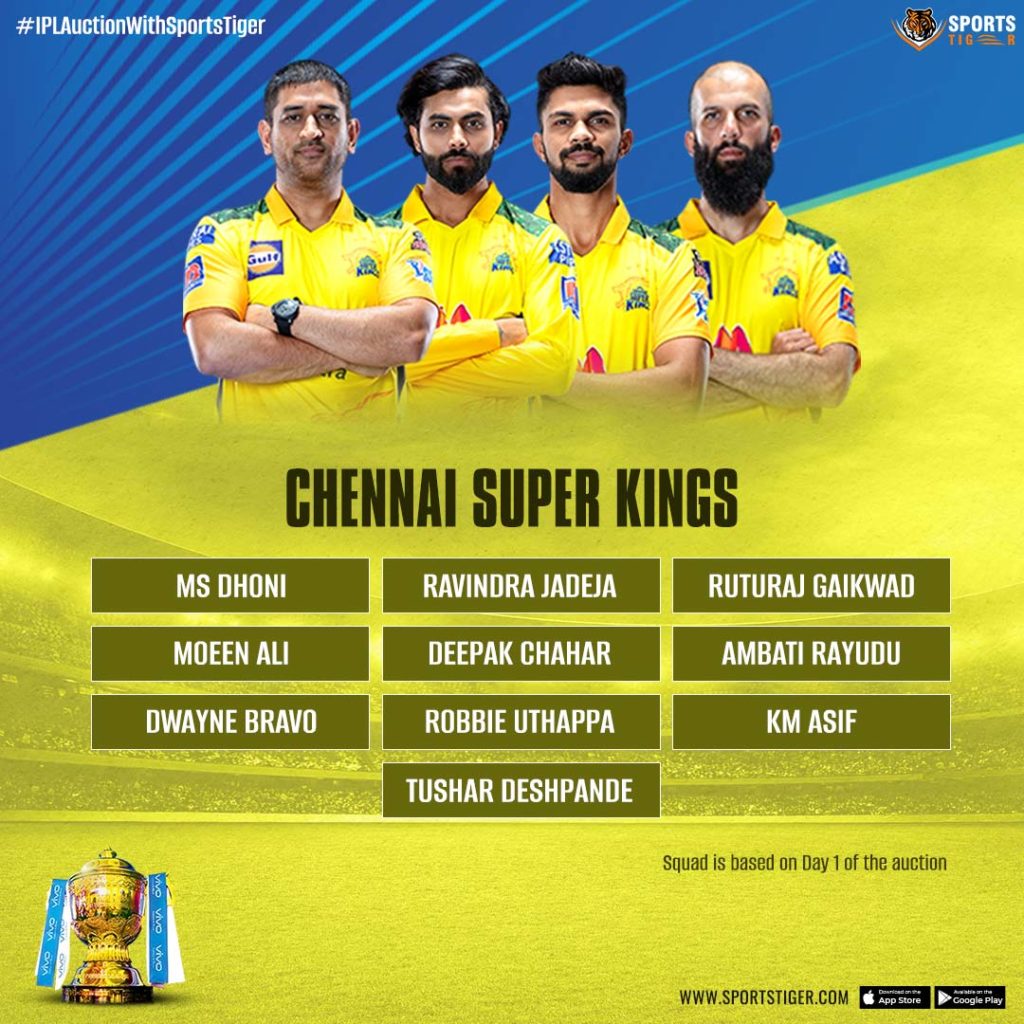 Chennai Super Kings: Ruturaj Gaikwad, Ambati Rayudu, Moeen Ali, MS Dhoni, Ravindra Jadeja, Deepak Chahar, Dwayne Bravo, Robin Uthappa, KM Asif, Tushar Deshpande
