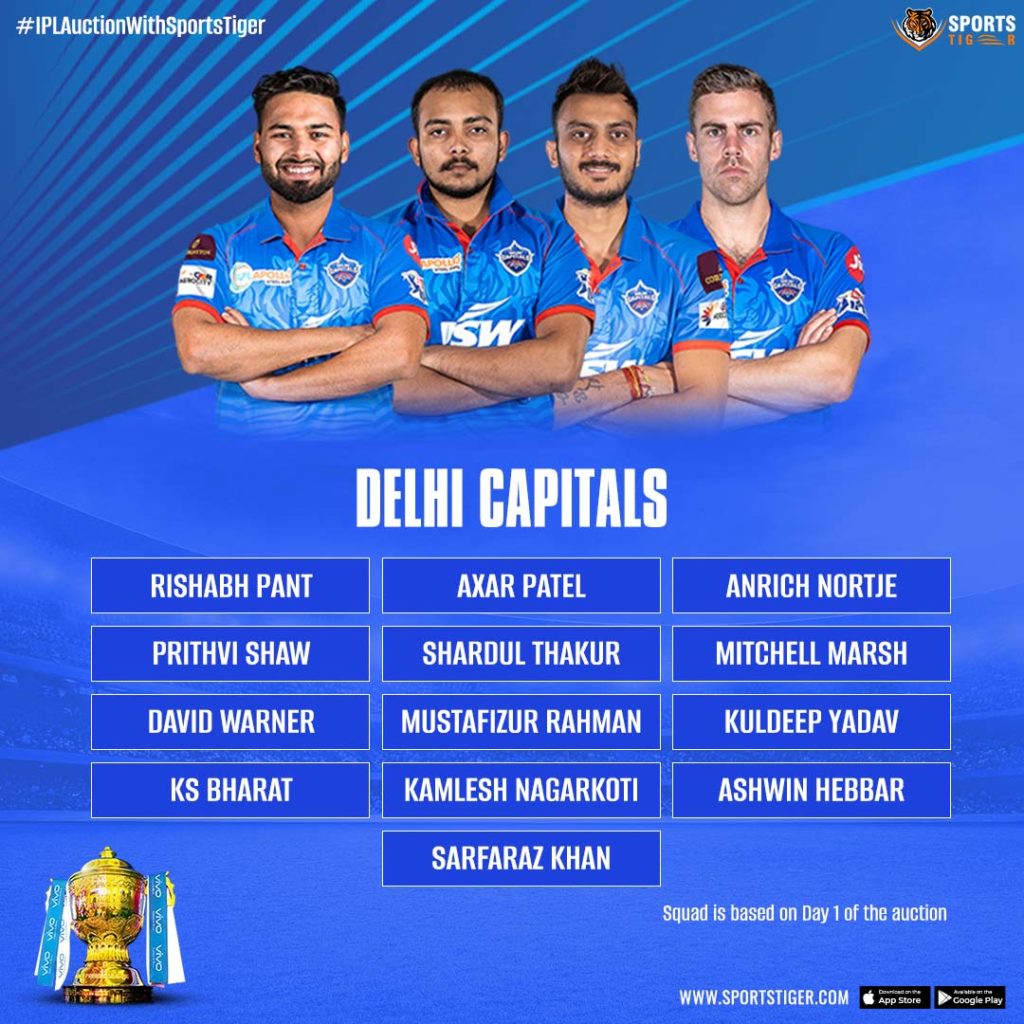 Delhi Capitals: David Warner, Prithvi Shaw, Mitchell Marsh, Rishabh Pant, Axar Patel, Shardul Thakur, Kuldeep Yadav, Anrich Nortje, Mustafizur Rahman, Sarfaraz Khan, KS Bharat, Kamlesh Nagarkoti, Ashwin Hebbar