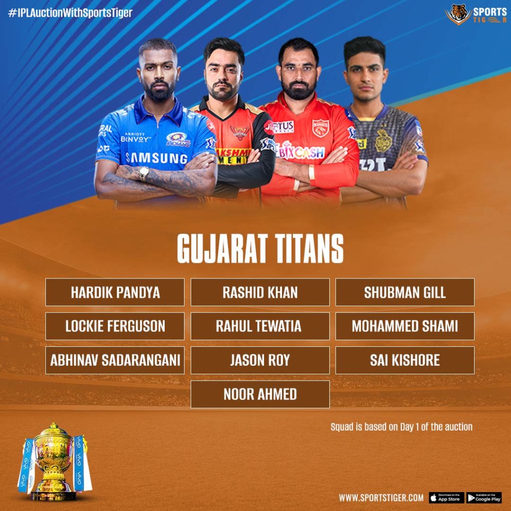 Gujarat Titans: Shubman Gill, Jason Roy, Hardik Pandya, Rashid Khan, Mohammed Shami, Lockie Ferguson, Rahul Tewatia, Noor Ahmad, Abhinav Manohar Sadarangani, R. Sai Kishore