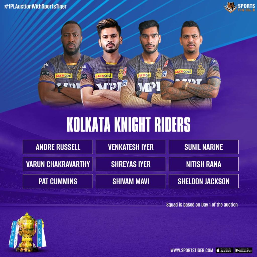 Kolkata Knight Riders: Venkatesh Iyer, Nitish Rana, Shreyas Iyer, Andre Russell, Sunil Narine, Pat Cummins, Varun Chakravarthy, Sheldon Jackson, Shivam Mavi