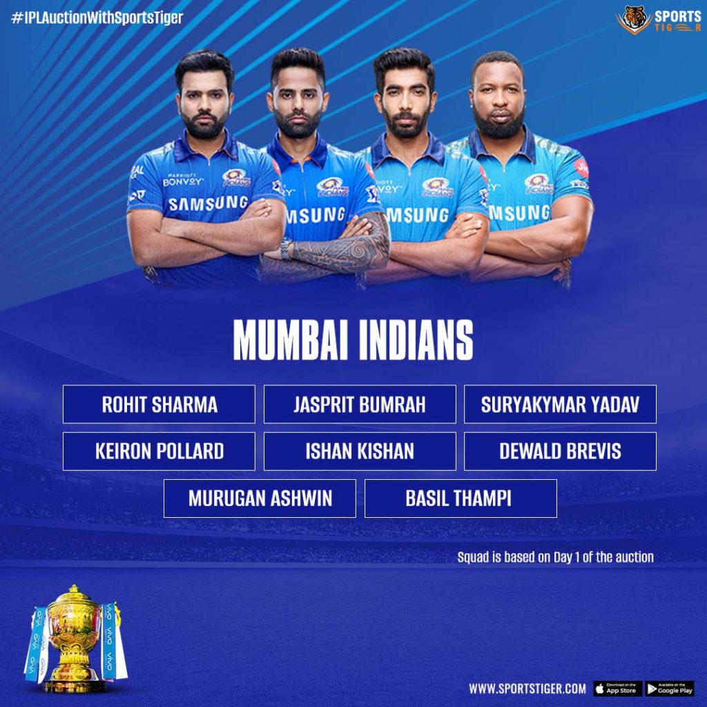 Mumbai Indians: Rohit Sharma, Ishan Kishan, Suryakumar Yadav, Kieron Pollard, Jasprit Bumrah, Murugan Ashwin, Dewald Brevis, Basil Thampi
