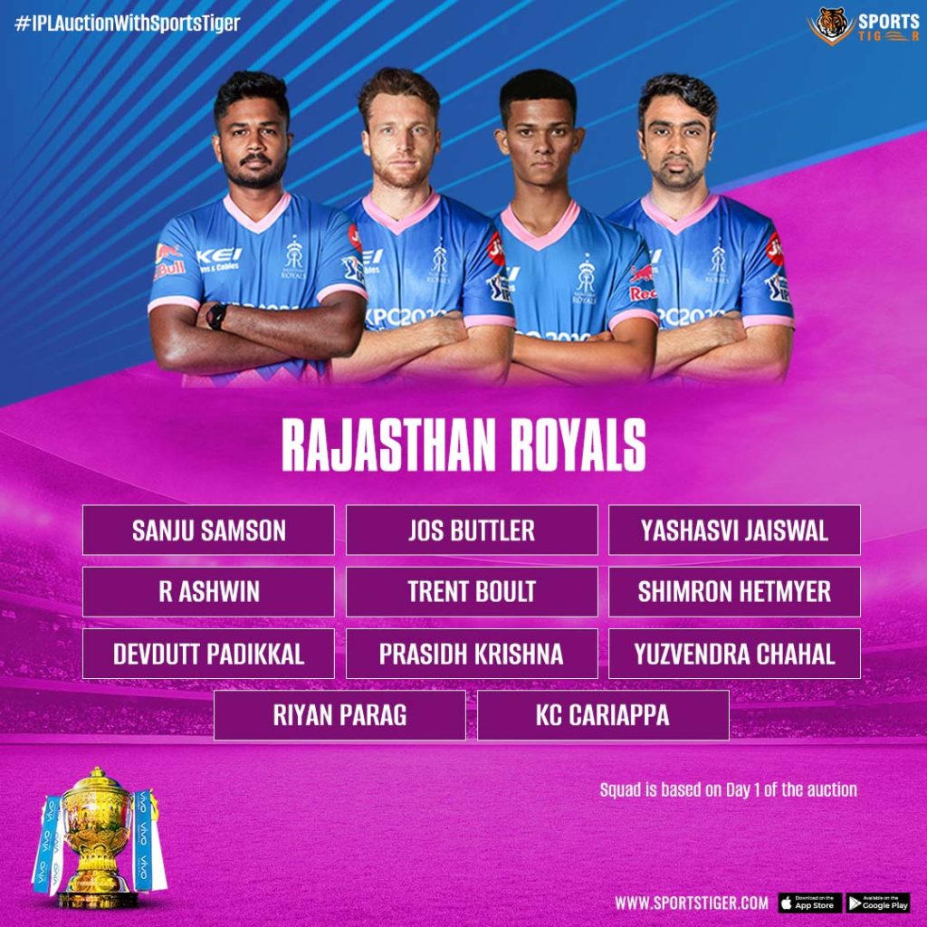 Rajasthan Royals: Devdutt Padikkal, Yashasvi Jaiswal, Sanju Samson, Jos Buttler, Shimron Hetmyer, R Ashwin, Trent Boult, Yuzvendra Chahal, Prasidh Krishna, Riyan Parag, KC Cariappa