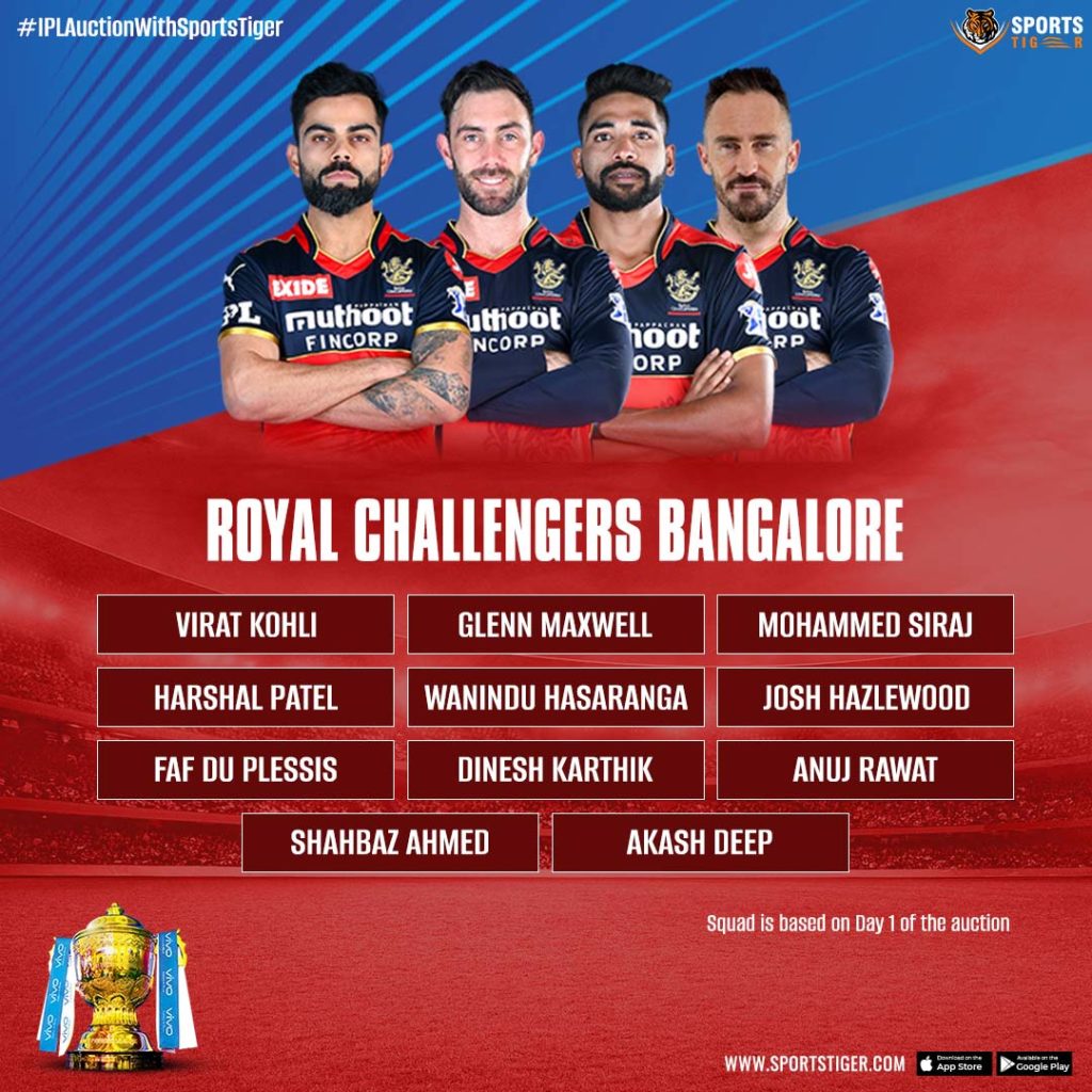 Royal Challengers Bangalore: Faf du Plessis, Virat Kohli, Glenn Maxwell, Dinesh Karthik, Wanindu Hasaranga, Harshal Patel, Josh Hazlewood, Mohammed Siraj, Shahbaz Ahamad, Anuj Rawat, Akash Deep