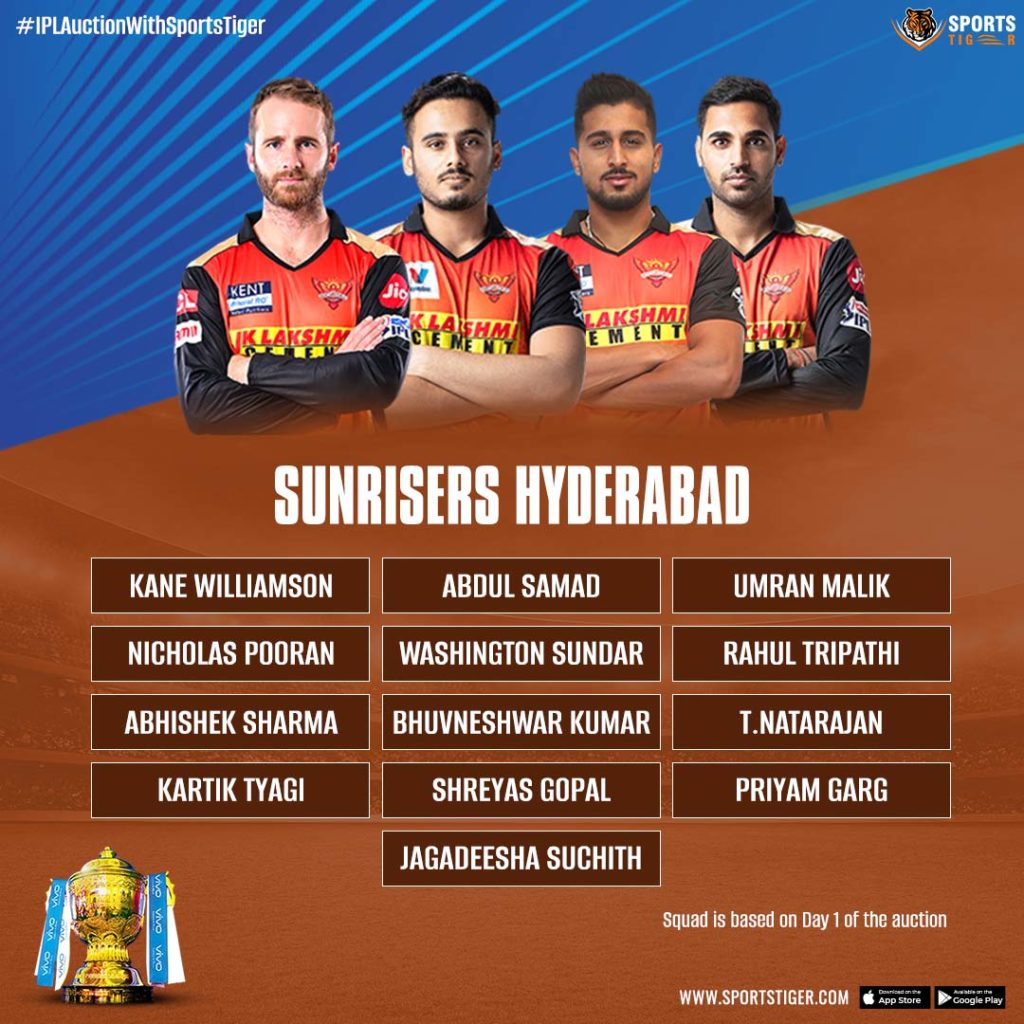 Sunrisers Hyderabad: Kane Williamson, Nicholas Pooran, Abdul Samad, Washington Sundar, Bhuvneshwar Kumar, T Natarajan, Umran Malik, J Suchith, Abhishek Sharma, Rahul Tripathi, Kartik Tyagi, Shreyas Gopal, Priyam Garg