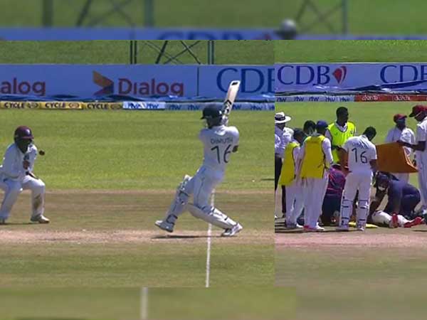 It was Roston Chase who was introduced into the attack for this over for the West Indies who were still looking to break the opening partnership. The fourth ball of this over was a short pitch delivery by the off-spinner pitching on middle and off and striker Dimuth Karunaratne had judged the length early and got into position early to pull this with all his might. However, it struck the short leg fielder on his helmet and Solozano took his helmet out and lay on the ground.