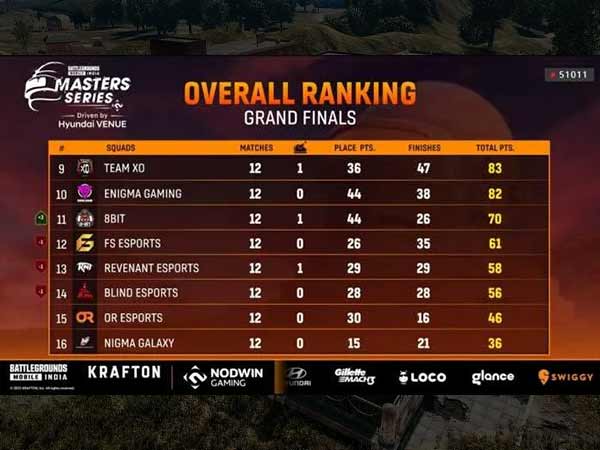 Blind Esports came second with 22 points and 10 finishes followed by Team GODLike, who made 14 kills to get the third spot.