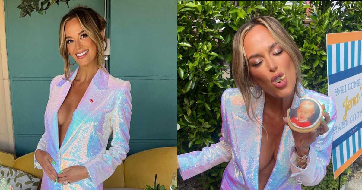 The wife of American pro-golfer Brooks Koepka, Jena Sims went viral on social media as she became a member of the ‘No-Bra Club’. Brooks and Jena are expecting their first child and hence threw a baby shower at the Georgian Hotel in Santa Monica, California. Here, the 34-year-old actress and model showed off her baby bump in a glitzy iridescent blazer on her social media.