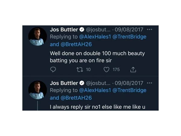 Screenshots widely shared include messages like "I always reply sir no1 else like me like you like me" from Buttler and "Sir, you play very good opening batting" from Morgan. This comes after England suspended Ollie Robinson over racist tweets.