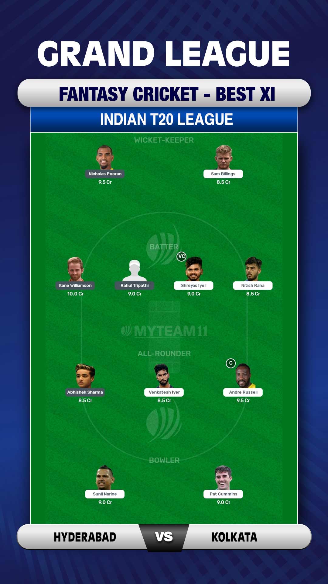 Whereas Hyderabad has captain Kane Williamson and Rahul Tripathi have looked in great form. In the bowling department, Sunil Narine, Pat Cummins and Umesh Yadav are the best picks from Kolkata, Bhuvneshwar Kumar and T Natarajan also must be part of your team. Both teams also boast all-rounders like Andre Russell, Ventakesh Iyer and Abhishek Sharma.