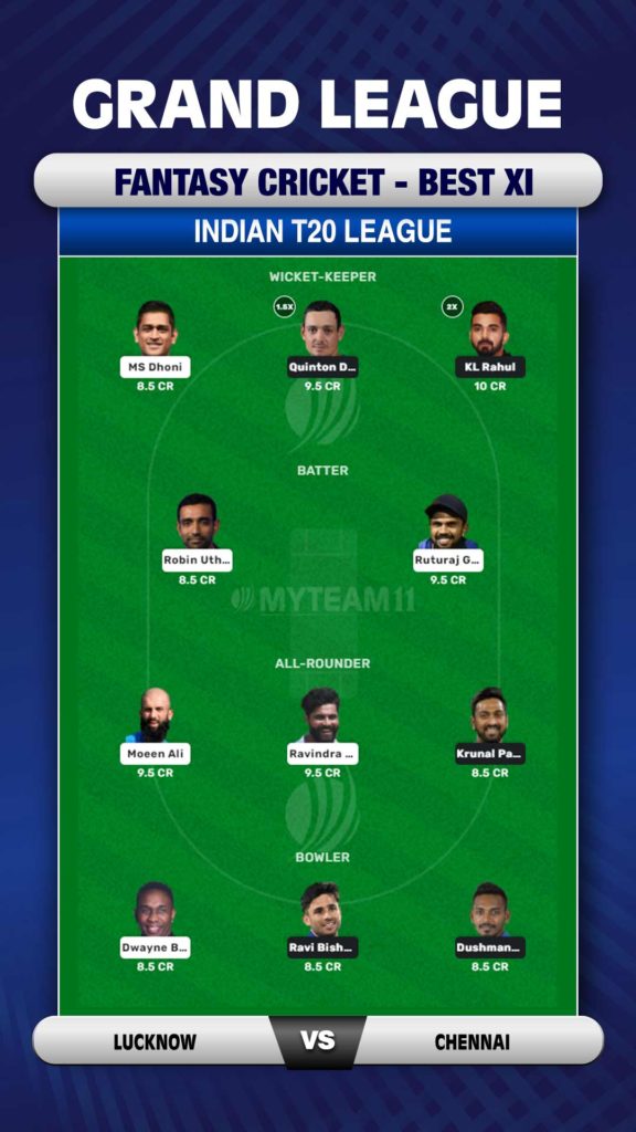KL Rahul went for a first ball-duck in his first game, but the Lucknow captain is expected to bounce back and score some runs for his team. So, he becomes a crucial player for the fantasy team. Deepak Hooda, Ayush Badoni, Quinton de Kock, and Evin Lewis can also be some good picks. From the Chennai camp, Robin Uthappa, Moeen Ali, and Ruturaj Gaikwad are expected to be among the run charts. In the bowling department, Dushmantha Chameera, Dwayne Bravo, Avesh Khan, and Ravi Bishnoi can be good picks.