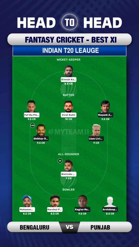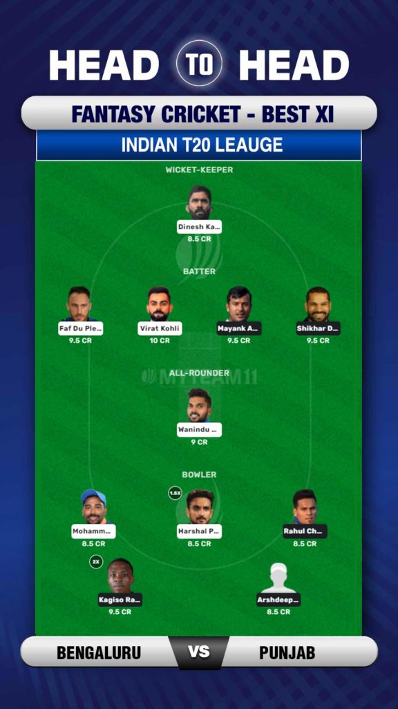 As this will be the first match for both these teams, it is difficult for selecting which players could give maximum points. But based on a combination of recent performances as well as reputation- the likes of Shikhar Dhawan, Mayank Agarwal, Virat Kohli and Faf du Plessis could be great picks as batters. Similarly in the bowling department, Harshal Patel, Mohd Siraj, Benny Howell, Rahul Chahar and Arshdeep Singh could be great options.