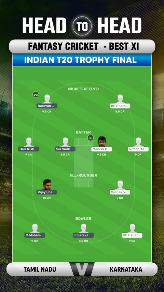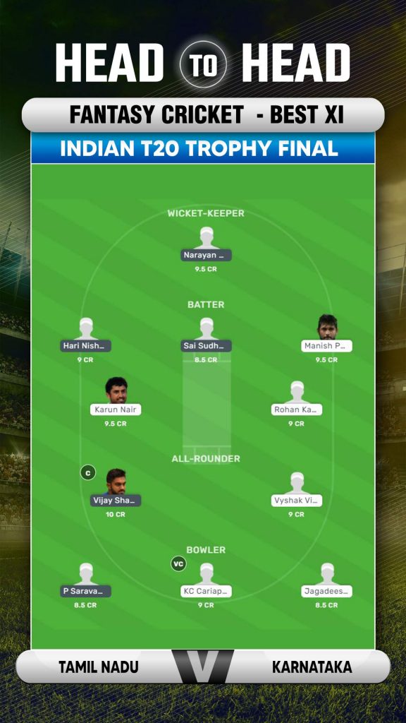 N Jagadeesan the wicketkeeper batter who bats at the top of the order is the preferred fantasy pick over his counterpart Sharath BR who could be a safe option behind the stumps but bats too low down the order to get a chance to have an impact on the match unless there is a batting collapse of sorts. Hari Nishanth, Rohan Kadam, Sai Sudharsan, Manish Pandey and Karun Nair are the options who could be the batting options who could be considered for selection in the fantasy side. Vijay Shankar, Vijaykumar Vyshak, Sanjay Yadav and Vidyadhar Patil have collected good fantasy points so far in the tournament and in a big game could come in handy. P Saravana Kumar, KC Cariappa, Jagadeesha Suchith, M Mohammed along with options like M Ashwin could be considered among the bowlers.