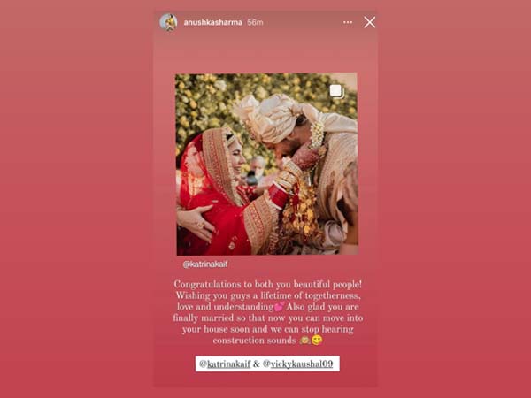 "Congratulations to both you beautiful people! Wishing you guys a lifetime of togetherness, love and understanding. Also glad you are finally married so that now you can move into your house soon and we can stop hearing construction sounds", Anushka wrote while posting Vicky and Katrina's wedding picture.
