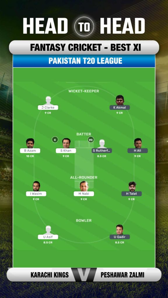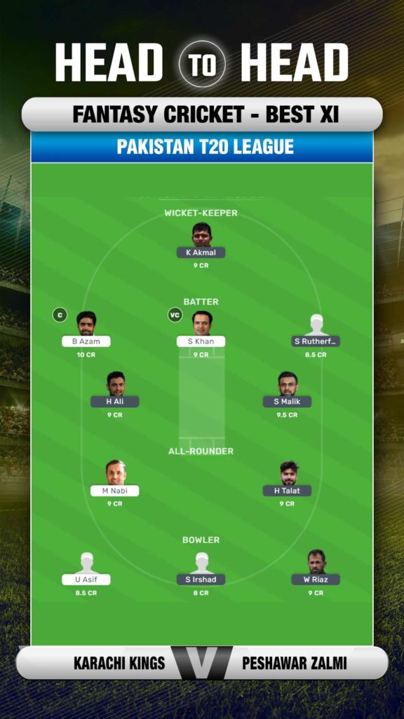 Babar Azam and Sharjeel Khan have provided a quick start to Karachi and remain good choices. Mohammad Nabi can find his rhythm anytime, so he also gets a place. From Zalmi's camp, Sherfane Rutherford, Kamran Akmal, Shoaib Malik and Hussain Talat remain top choices. Usman Qadir can be a good pick from the bowlers' category.