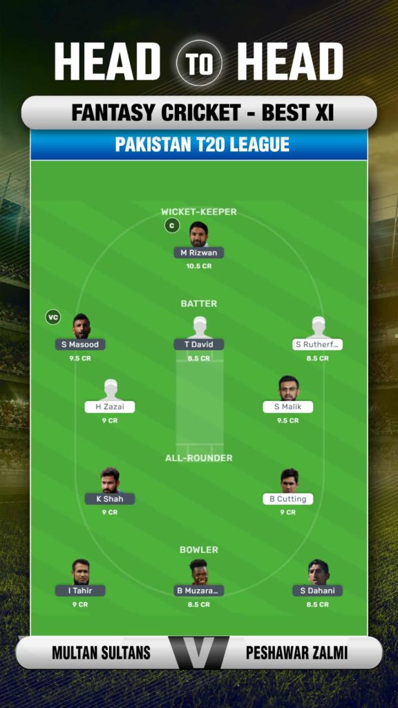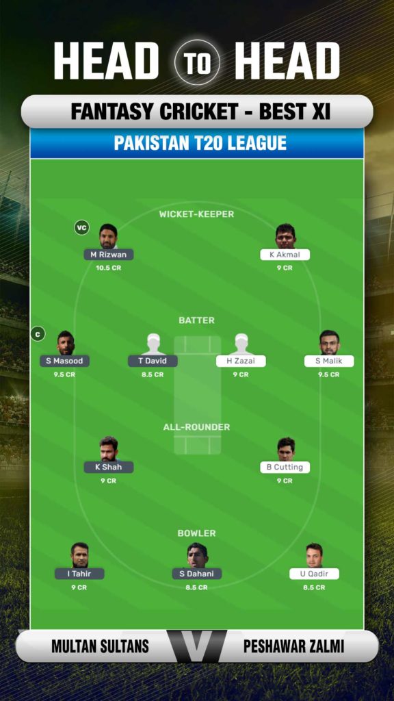 Shan Masood and Mohammad Rizwan have performed consistently for Multan Sultans so they straightaway into the fantasy team. Tim David has also found his mojo back after a sluggish start to the tournament. From Zalmi's camp, Shoaib Malik is always a good option to have. Kamran Akmal is also a good pick with his quick run-scoring abilities. From the bowlers' category, Usman Qadir, Shahnawaz Dahani can prove to be good picks.