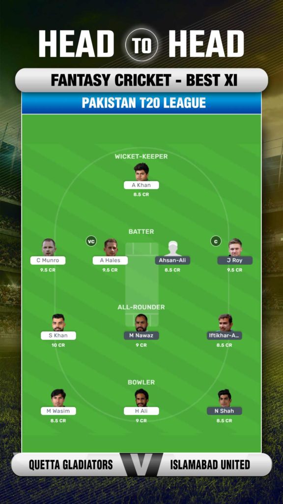 Islamabad's captain Shadab Khan has continuously delivered for his team and remains a top pick. Jason Roy, Alex Hales, Paul Stirling and Colin Munro are other good choices. Hasan Ali, Mohammad Wasim Jr, James Faulkner, and Naseem Shah are some of the top bowling choices.