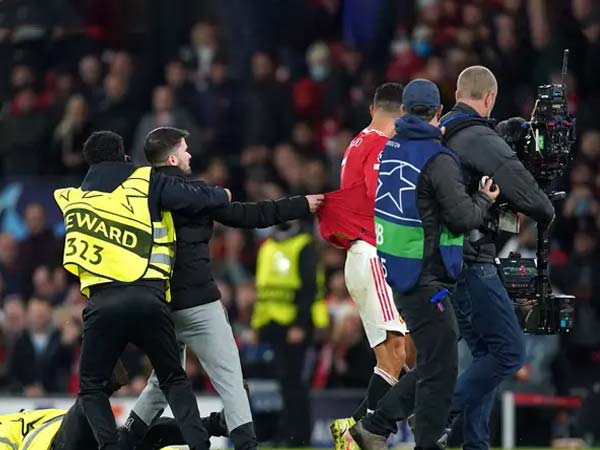 The 36-year-old was expectedly ecstatic after the full-time whistle had blown and the Theatre of Dreams had erupted with chants of him. As CR7 was walking off the field, the fans were chanting his name and applauding him for his heroic performance but one supporter lost the plot as he jumped on the ground and stormed towards the Portuguese star player.