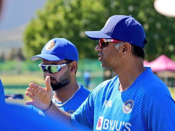 India head coach Rahul Dravid (Right) speaks to the team as wicketkeeper batter Rishabh Pant listens. (Picture Credit: Twitter/@BCCI)[/caption]