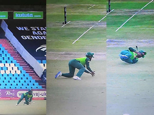 It happened in the 46th over of the Pakistan innings, when Nawaz tried to pounced on a short ball to hit it around the cover region. Though he slapped the ball with sheer power, he couldn't place it in the gap. Bavuma, who was stationed at cover, dived to his right to pull off an stunning catch.