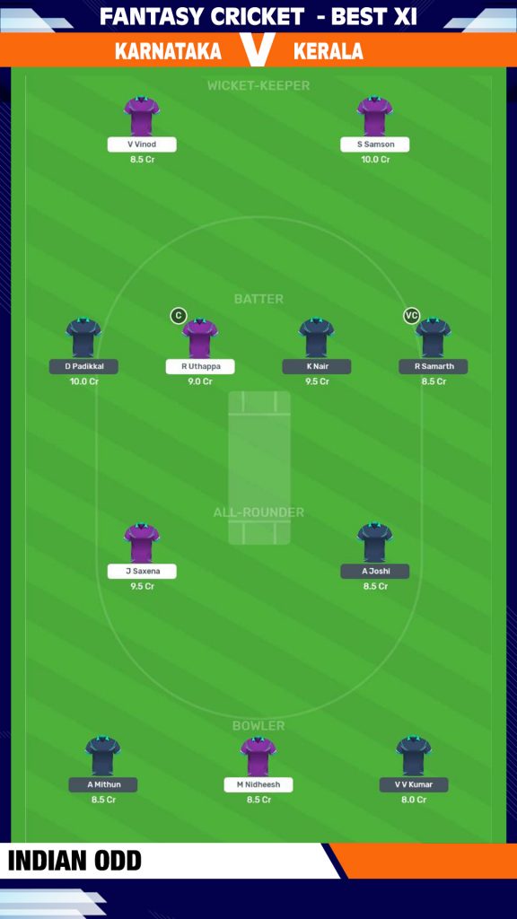 Ravikumar Samarth (c), Devdutt Padikkal, K Siddarth, Karun Nair, Aniruddha Joshi, Abhimanyu Mithun, J Suchith, Sharath BR (wk), Shreyas Gopal, Vyshak V Kumar, Prasidh Krishna
