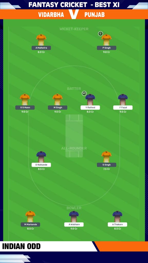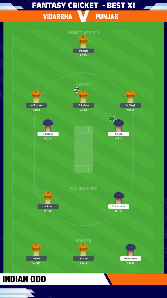 Faiz Fazal (c), Sanjay Raghunath, Ganesh Satish, Yash Rathod, Akshay Wadkar (wk), Apoorv Wankhade, Akshay Karnewar, Aditya Sarwate, Darshan Nalkande, Aditya Thakare, Shubham Dubey, Akshay Wakhare