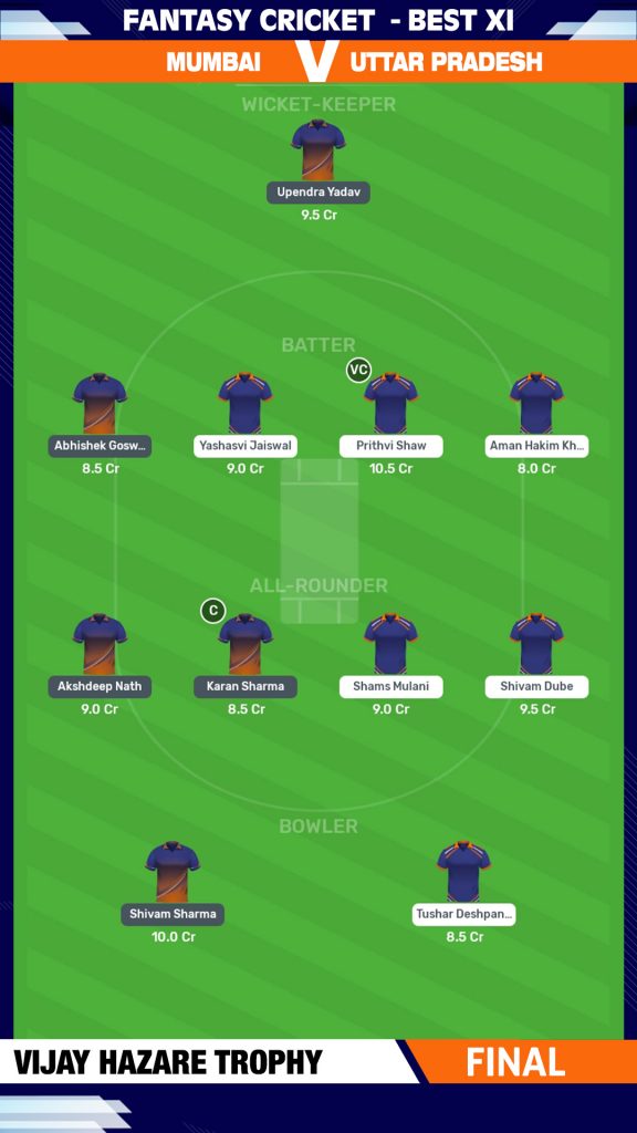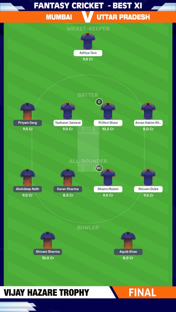 Yashasvi Jaiswal, Prithvi Shaw (c), Sarfaraz Khan, Shivam Dube, Aditya Tare (wk), Aman Hakim Khan, Shams Mulani, Prashant Solanki, Mohit Avasthi, Tushar Deshpande, Tanush Kotian