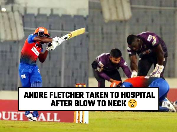 On the first delivery of the seventh over, young pacer Rejaur Rahman bowled a bouncer with sheer pace. Andre Fletcher who was hitting bowlers all over the park tried to take on Rahman from the first ball. He tried dispatching the ball for a boundary but he completely missed the ball and it hit him on the neck. In no time, Fletcher was on the ground in a lot of pain. The physios came in and stretchered Fletcher off the field.