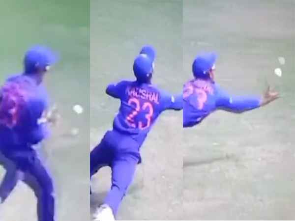 While England was struggling to stay on the crease, James Rew and James Sales steadied England's innings. Both players built a much-needed partnership for the team and took the team to a respectable total before Rew was departed off Kaushal Tambe's brilliance in the field. Rew timed the pull shot nicely but it was not enough to cross the boundary. Tambe dived forward to recollect it and barely got hold of the ball.