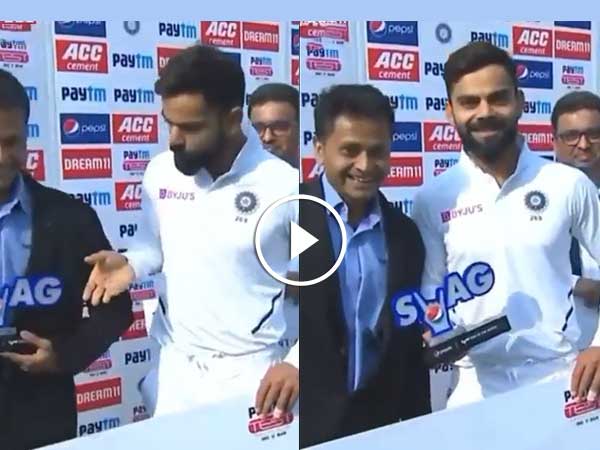 Although Kohli hasn't managed to win a single title with the Bangalore franchise, it is no secret that he loves holding on to the silverware. A video doing the rounds on the internet is a testimony to the same. The old clip in which the India skipper can be seen receiving an award for his performance with the bat has left the netizens in splits. It appears to be from India's first-ever Pink-ball Test at the Eden Gardens in Kolkata against Bangladesh. Kohli had scored a brilliant hundred in this game and was selected for an award.