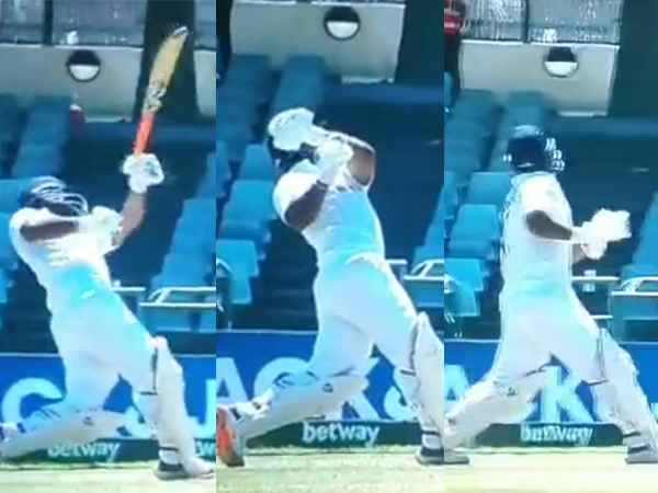 On the first ball of the 60th over of India's second innings, Pant threw everything at the ball from Duanne Olivier. However, in spite of sending the ball into the stands, Pant lost grip of his bat handle and the willow went flying. For a few seconds, the cameraman and Rishabh Pant kept searching for it and found it somewhere 12-15 feet away from the batsman.