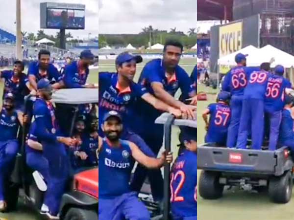 In the golf cart, Rishabh Pant and Ishan Kishan sat beside Rohit. Axar Patel and Sanju Samson stood on the entrance, while Dinesh Karthik, Deepak Hooda, R Ashwin, Ravi Bishnoi and Suryakumar Yadav stood & sat in the back of the cart.