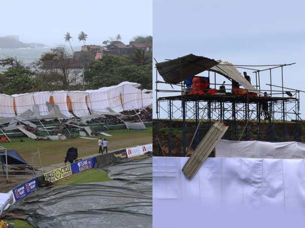 The second day of the first Test between Australia and Sri Lanka got to an unforeseen start because of the huge rains that led to the delay. The rains also had an undesired impact as they took out one of the makeshift stands at Galle’s stadium as the entire structure crumbled. On the other side of the ground, a glass panel collapsed in front of the Australian team’s dugout. Thankfully, reports say no players, ground staff or spectators were harmed.