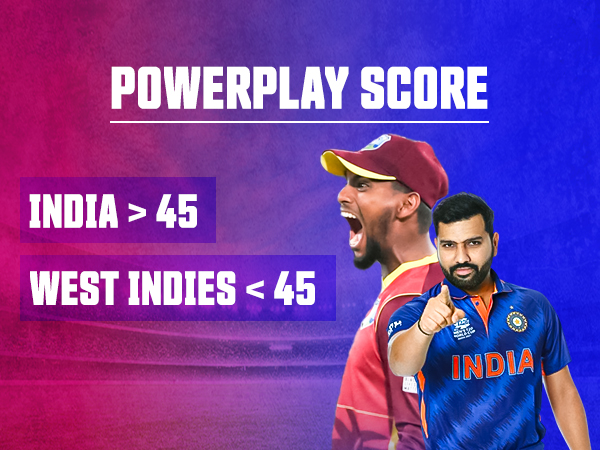 India's average powerplay score in this series has been 50.5 while West Indies have scored runs at an average of 44 in the powerplay. So predicting India to score above 45 in the first six overs while Windies could end with fewer runs than that.