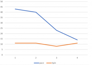 4th inns: Pace - 14 wickets (135 overs); Spin - 11 wickets (66.4 overs)