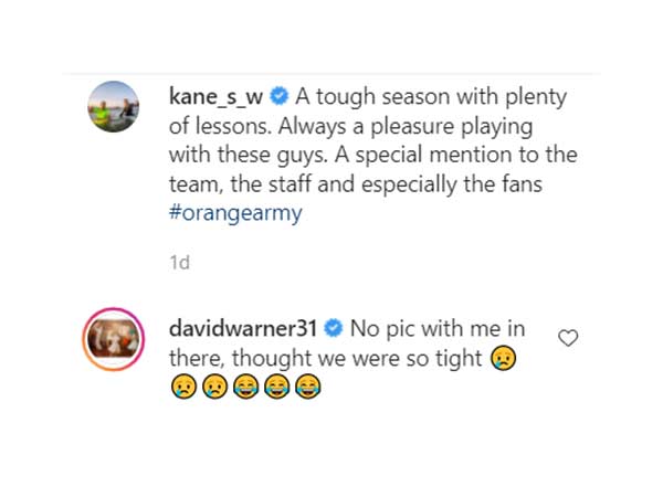 And now he has dropped in another comment on Kane Williamson's Instagram post where the SunRisers can be seen in a team huddle. While Williamson had captioned his picture, "A tough season with plenty of lessons. Always a pleasure playing with these guys. A special mention to the team, the staff and especially the fans #orangearmy," Warner commented, "No pic with me in there, thought we were so tight."