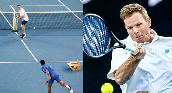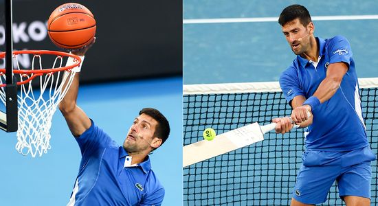 Steve Smith shows off his tennis skills against Novak Djokovic.