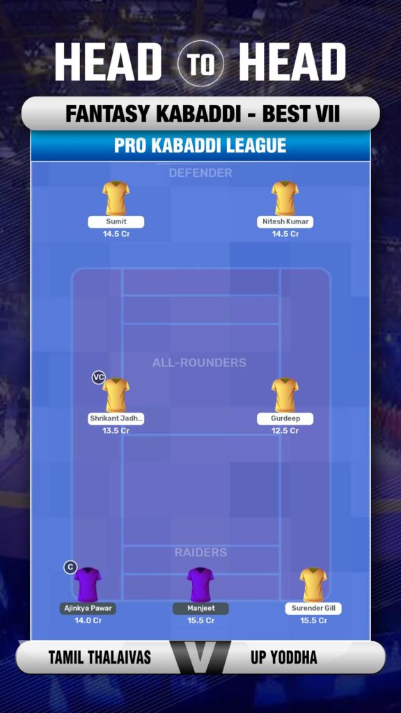 Tamil Thalaivas: Manjeet, Surjeet Singh, Bhavani Rajput, Ajinkya Pawar, Sahil Gulia, Mohit, Sagar